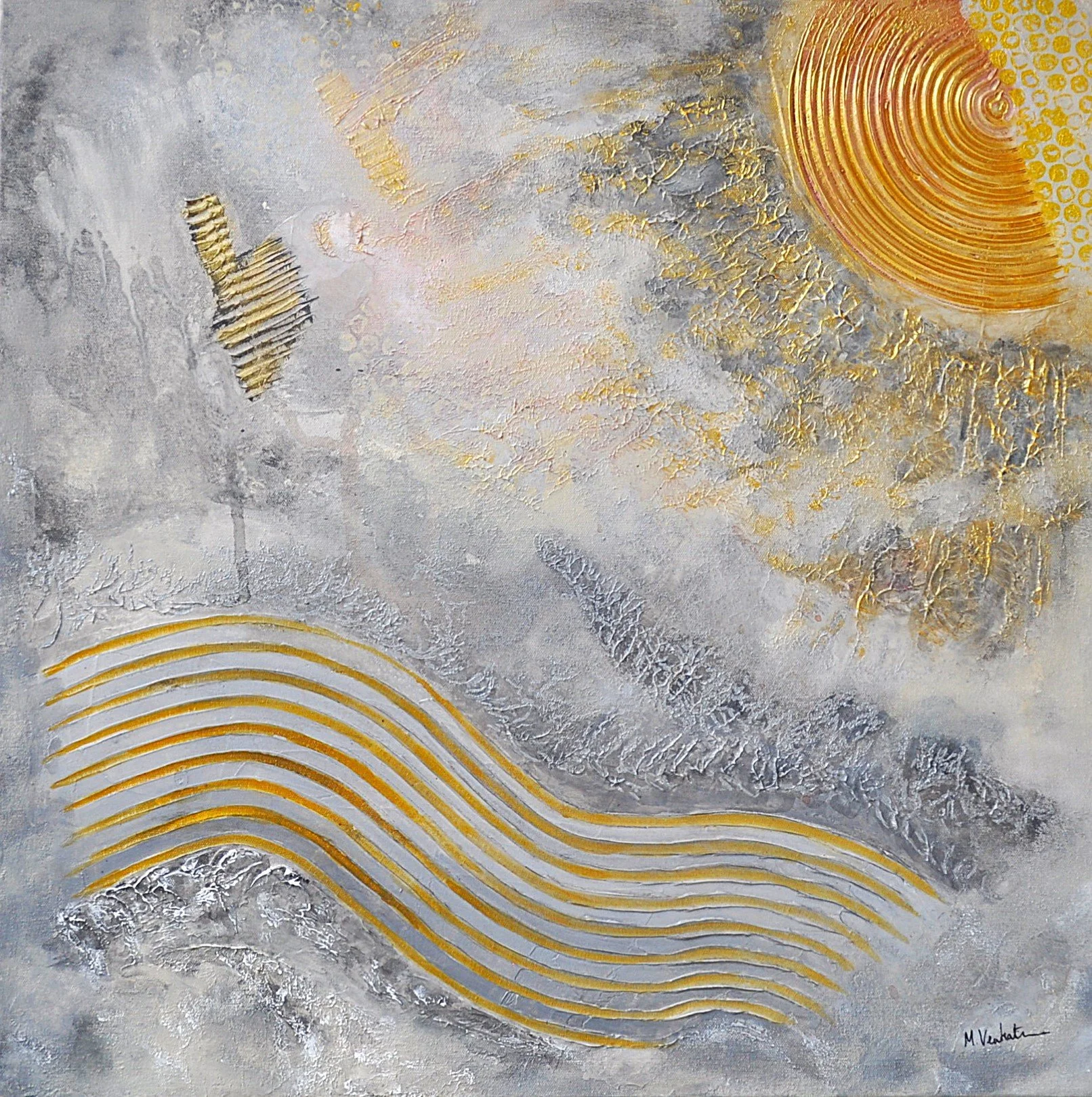 Description: An abstract painting depicting a mystical scene of a golden sun reflecting on a river.
